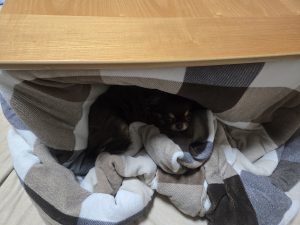 こたつ布団と一体化してしまっています。