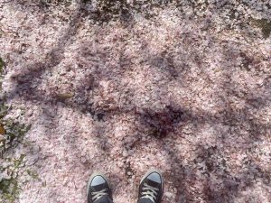 前日の大雨でところどころ桜の絨毯ができていました。息子たちも綺麗〜!と喜んでいました。